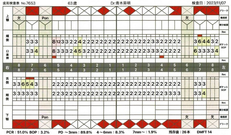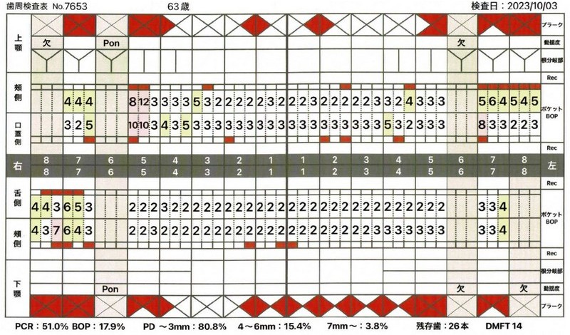 診察の結果、歯肉の状態や歯周病PCR検査によって中等度〜重度の歯周病と診断。放置すれば歯を失う可能性もある状態でした。