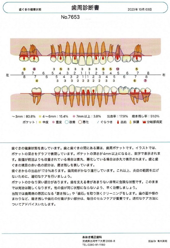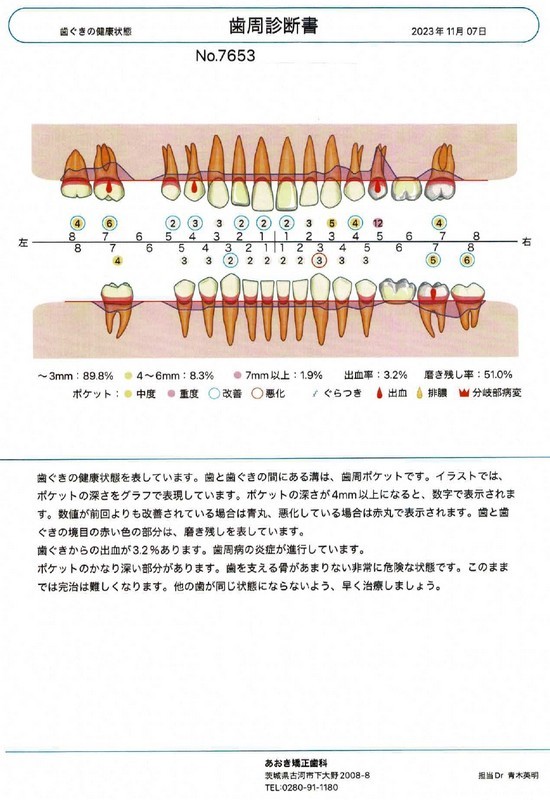 治療後は、腫れや出血が消え、ポケット深さも3〜4mmに改善。就寝時に口の中が気持ち悪くておきてしまう事もなくなりました。